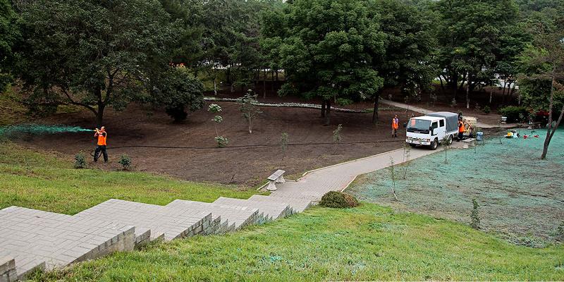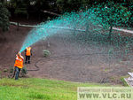 Как сообщили в МБУ "Горзеленстрой", в настоящее время специалисты приступили к озеленению газонов в Курсантском сквере методом гидропосева. Эта технология позволяет сократить потери при всходе семян и стоит в 2 раза дешевле, чем ручное сеяние. Предварительно в сквер был завезён и укатан чернозём, проведён анализ почвы и принято решение, какие лучше использовать удобрения и семена. Технология гидропосева представляет собой эмульсию, в состав которой входят удобрения, семена, клей (если технология используются на склонах) и гидрогель, который позволяет около месяца не поливать засеянную территорию. Как рассказал мастер МБУ "Горзеленстрой" Антон Демичев, красящее вещество зелёного цвета применяется не для покраски газона, а для того, чтобы мастер, укладывающий посев, видел, где участок засеян, а где нет.