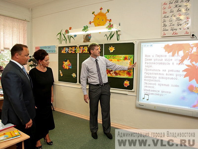 Игорь Пушкарёв поздравил собравшихся с 1 сентября, пожелал ребятам успешно учиться, а здоровье укреплять на новой спортивной площадке. Позже мэр прошел по кабинетам образовательного учреждения. В этом году по заданию мэра были куплены 43 интерактивные доски в школы Владивостока. Одна такая современная сенсорная доска, с мультимедийным проектором и ноутбуком в комплекте, появилась и в школе №10. Главе города продемонстрировали ее возможности. Она позволяет делать уроки насыщенными, интересными, облегчает работу учителя, вовлекает детей в учебный процесс. На сенсорной доске в игровой форме можно изучать с детьми разные науки. В комплекте есть и музыкальное сопровождение.
