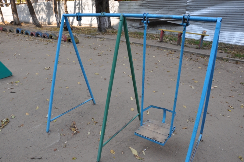 Данную площадку установили несколько лет назад. За это время игровой комплекс успел «поизноситься»: сломалась лесенка центральной «горки»; качели, лавочки, песочница требуют уже ремонта.