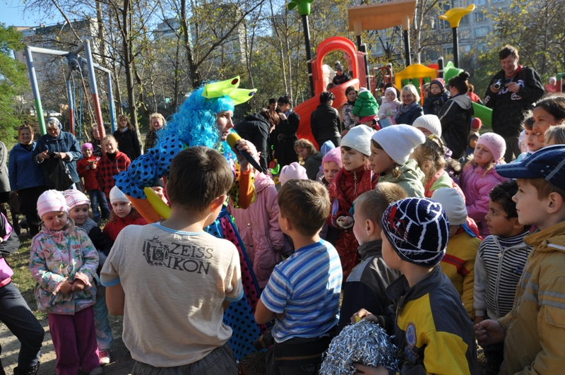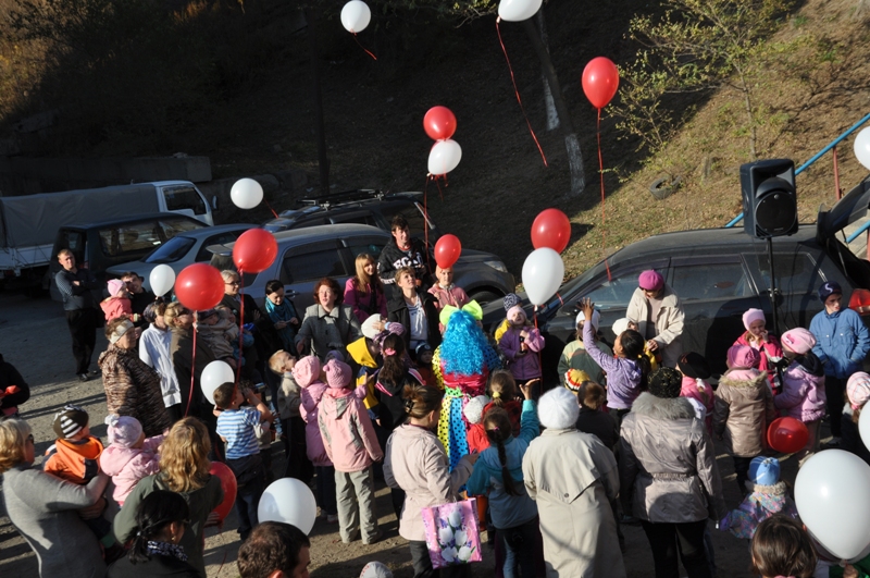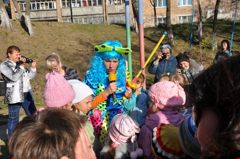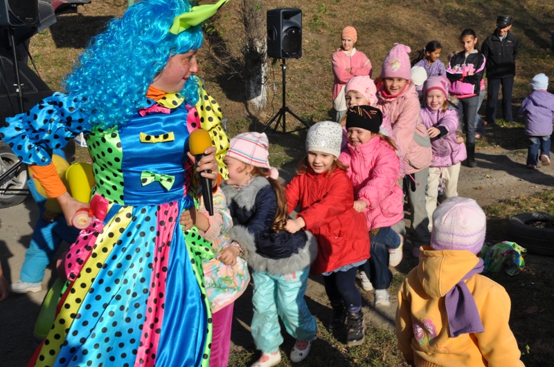 На праздник собрались ребятишки со всех ближайших домов. Вместе с веселым клоуном дети играли в различные игры, танцевали, отгадывали загадки и даже создавали забавную какофонию с помощью бубнов.