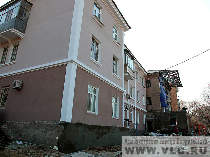 В уцелевшей части дома полностью окрасили фасад, установили каркасы козырьков над подъездами, укрепили крючья для установки подвесных желобов для водостока. Строительные леса уже убрали, в ближайшее время начнется благоустройство территории.