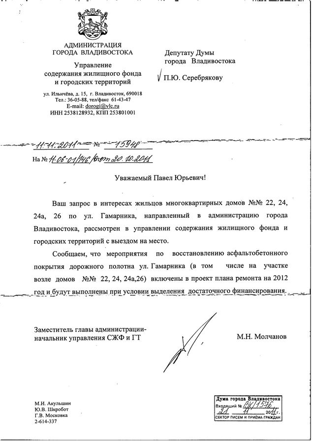 В ответе управления содержания жилищного фонда и городских территорий на запрос депутата говорится, что мероприятия по восстановлению асфальтобетонного покрытия дорожного полотна ул. Гамарника, в том числе на участке домов ул. Гамарника,22, 24, 24а, 26, включены в план ремонта на 2012 год.