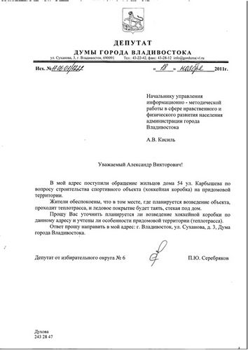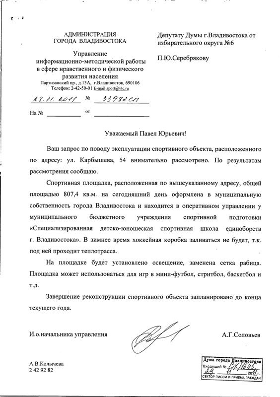 В ответе на запрос депутата сказано, что спортивная площадка, расположенная по адресу ул. Карбышева,54, общей площадь. 807,4 кв. м. на сегодняшний день оформлена в муниципальную собственность города. Она находится в оперативном управлении у муниципального бюджетного учреждения спортивной подготовки «Специализированная детско-юношеская спортивная школа единоборств Владивостока». В зимнее время коробка заливаться не будет, т. к. под ней проходит теплотрасса.