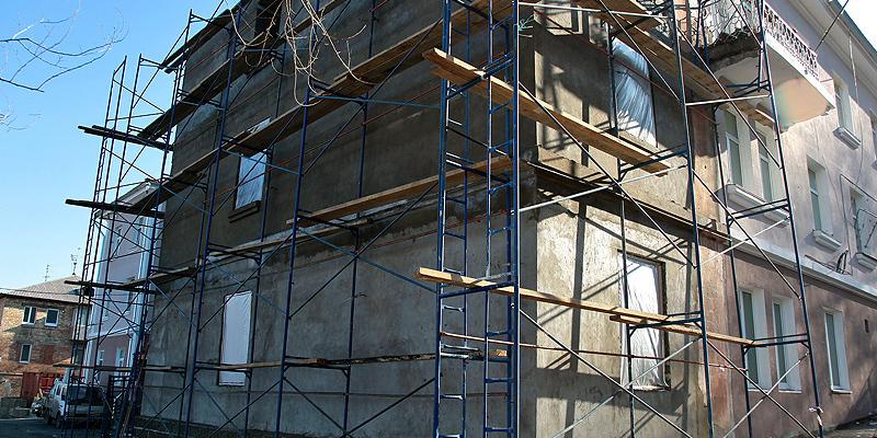 Стены уцелевшей части дома специалисты укрепили с помощью металлических пластин и химических анкеров. Пояс из металлических пластин, в которые на специальный химический состав "сажают" анкера, опоясывает дом по всему периметру. Также строители оштукатурили стены, сделали фактурную отделку, оформили цоколь и покрасили здание в четыре цвета. Территория вокруг дома заасфальтирована, уложены лестничные марши.