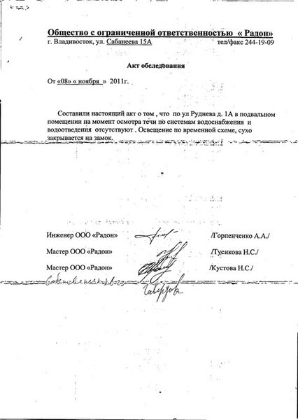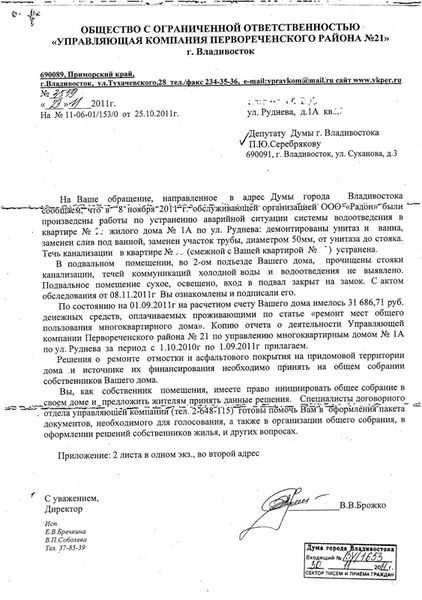 В ответа обращение депутата Первореченская управляющая компания сообщила, что все ремонтные работы по устранению аварийной ситуации были выполнены 8 ноября 2011 года. В подвале помещения второго подъезда дома почищены стояки канализации, течей коммуникации холодной воды и водоотведения не выявлено. Подвальное помещение сухое, освещено, вход в подвал закрыт на замок.