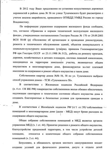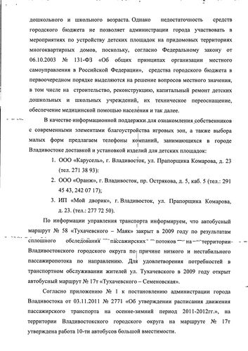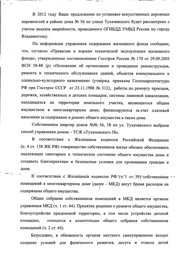Благоустройство ул. Тухачевского продолжится в 2012 году![]() Благоустройство ул. Тухачевского продолжится в 2012 году. Это следует из ответа администрации Владивостока на запрос депутата Павла Серебрякова. В ходе придомовой встречи с жильцами домов на ул. Тухачевского Павлу Серебрякову поступили обращения жителей по поводу благоустройства района и придомовой территории. На их основе депутат сделал запрос в администрацию города с изложением замечаний и предложений граждан. В ответе, полученном депутатом, говорится, что мероприятия по восстановлению лестниц от домов ул. Тухачевского,56, 58 к домам на ул. Тухачевского, 24, 26, 28 были включены в четвертый этап ремонта лестниц на 2011 год. Однако по результатам аукциона подрядная организация не была определена, в связи с чем, данные мероприятия перенесены на 2012 год и будут выполнены при условии выделения достаточного финансирования. Также жителей БАМа беспокоил вопрос отсутствия разметки на месте пешеходного перехода, что делает переход небезопасным. По этому поводу был дан ответ, что подрядной организации МУПВ «Дороги Владивостока» выдано задание на производство работ по нанесению дорожной разметки пешеходного перехода в районе остановки «Стройматериалы» на ул. Тухачевского,52. Предложение по установке искусственных дорожных неровностей в районе дома на ул. Тухачевского,56 будет рассмотрено с учётом анализа аварийности, проводимого ОГИБДД УМВД России по городу Владивостоку. Также из ответа следует, что ремонт проезда, дорожек, хозяйственных и детских площадок, системы ливневой канализации, находящихся на территории земельного участка, являющегося общим имуществом многоквартирного дома, финансируются за счёт платежей населения на содержание и ремонт общего имущества в таком доме. И сами ремонтные работы должны осуществляться ТСЖ «Тухачевского,58». Потому что собственники домов ул. Тухачевского,56, 58 выбрали способ управления домом ТСЖ «Тухачевского,58». А принятие решения о ремонте общего имущества, благоустройстве придомовой территории, в том числе устройстве детской площадки, относится к компетенции общего собрания собственников помещений. Безусловно, в обязанности местного самоуправления входит создание условий для физического развития, досуга и отдыха детей дошкольного и школьного возраста, однако недостаточность средств городского бюджета не позволяет администрации города участвовать в мероприятиях по устройству детских площадок на придомовых территориях детских домов, поскольку в первую очередь средства выделяются на ремонт и восстановление детских учреждений, их техническое переоснащение и т.д. По поводу автобусного маршрута №58 «Тухачевского- Маяк» был дан ответ, что он был закрыт в 2009 году по причине низкого пассажиропотока. Для удовлетворения потребностей жителей БАМа был открыт маршрут №17т «Тухачевского-Семеновская». На осенне-зимний период администраций города была утверждена работа 10 автобусов большой вместимостью.