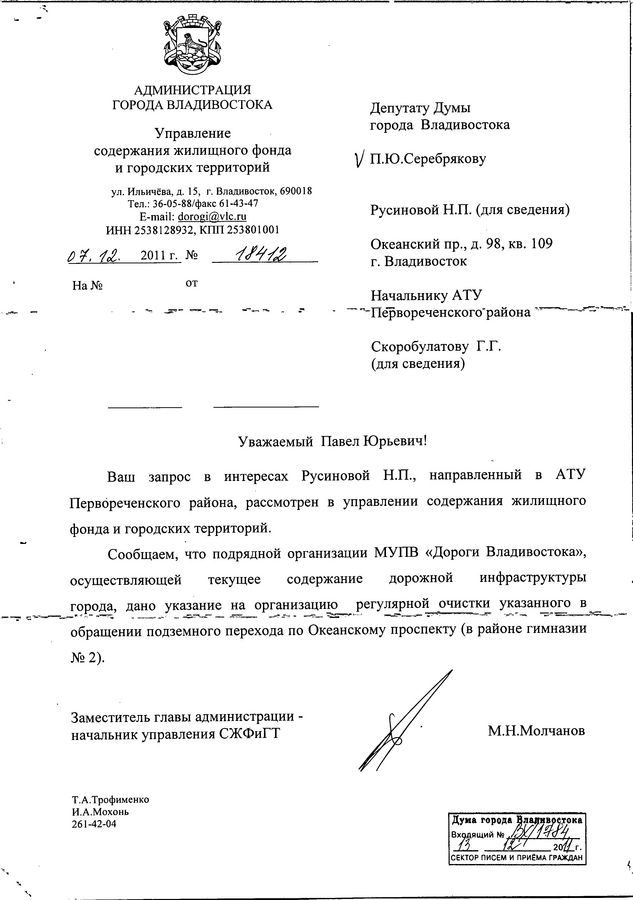 Кроме того, теперь пешеход будет регулярно убираться. Подрядной организации МУПВ «Дороги Владивостока», осуществляющей текущее содержание дорожной инфраструктуры города, дано указание на организацию регулярной очистки указанного в обращении подземного перехода на Океанском проспекте, в районе гимназии №2.