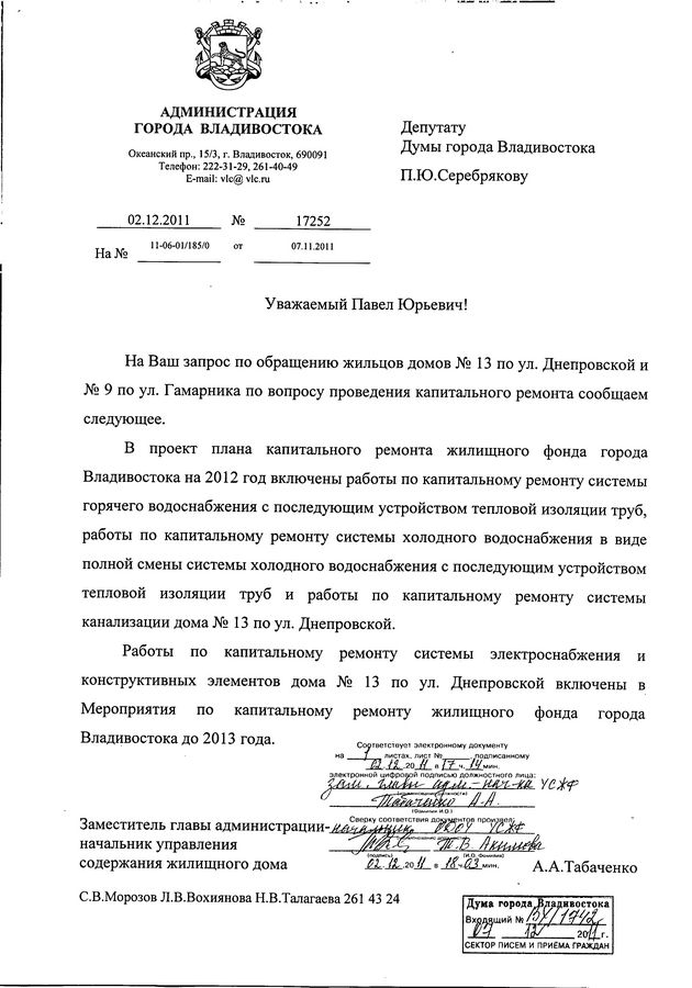 В ответе на запрос говорится, что в проект плана капитального ремонта жилищного фонда Владивостока на 2012 год включены работы по указанному адресу по капитальному ремонту системы горячего водоснабжения с последующим устройством тепловой изоляции труб, работы по капитальному ремонту системы холодного водоснабжения в виде полной смены системы холодного водоснабжения с последующим устройством тепловой изоляции труб и работы по капитальному ремонту системы канализации.