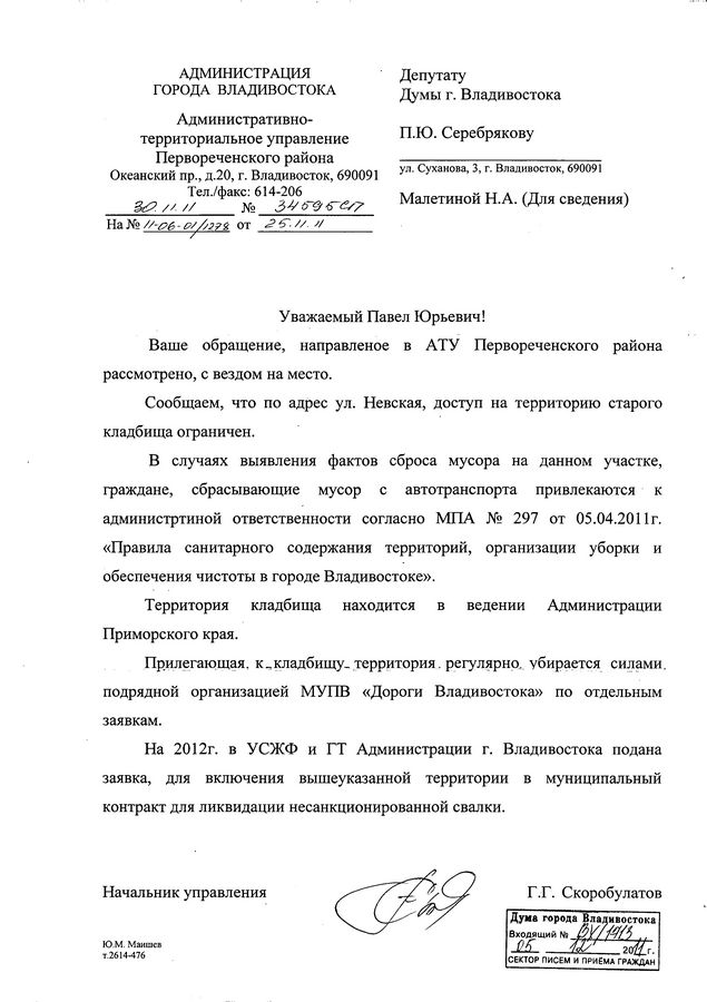 В адрес Павла Серебрякова поступило обращение жительницы района о ненадлежащем состоянии кладбища в районе ул. Невская. Дело в том, что туда постоянно свозится мусор, дорожки не расчищаются. По данному сигналу депутат направил письмо в администрацию Первореченского района.