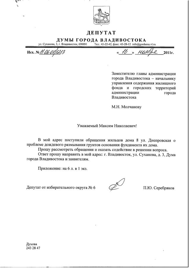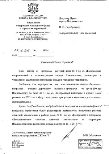 Дорогу от ул. 100-лет Владивостока до Днепровской отремонтируют в 2012 году![]() Дорогу от ул. 100-лет Владивостока до Днепровской отремонтируют в 2012 году. Также не исключена возможность включения этой территории в муниципальную программу «Восстановление системы ливневой канализации на 2011-2015 год». Об этом сообщила городская администрация в ответе на запрос депутата Павла Серебрякова. Дело в том, что проблема дождевого размывания грунтов основания фундаментов жилого дома по улю Днепровской,8 встала достаточно остро. Она изначально была создана инженерной ошибкой при проектировании системы водоотведения дождевых стоков с нагорной территории на ул. Днепровская, бани ТОВМИ и проспекта 100 лет Владивостоку. Поперечный и продольный профили ул. Днепровской запроектированы без нагорного дождеприёмника с уклоном в сторону нижерасположенного скоса к дороге. При значительной площади водосбора, искусственно созданный здесь ливневой поток устремляется с большой скоростью по правому краю улицы, направляемый вниз только ограждающими дорожными бордюрами. В местах примыкания к улице проездов, на которых нет бордюров, этот водный поток разветвляется и течёт по ним, разрушая асфальтовое покрытие и промывая водотоки в грунте. Это формирует микроовражную сеть на склонах. Одновременно происходит затопление плоских участков придомовой территории. В результате дом получил просадку фундаментов и трещины по стенам. Размывание откоса и оврагообразование однажды уже привели к разрушению наружной лестницы. Спустя 24 года она уже готова обрушиться не имея под собой грунтовой основы. По этому поводу в адрес депутата Павла Серебрякова поступило обращение жильцов дома ул. Днепровская,8 с просьбой помочь разобраться с проблемой и посодействовать в ее решении. С этой целью в администрацию Владивостока был направлен запрос. В ответе на запрос говорится, что мероприятия по восстановлению асфальтобетонного покрытия участка дорожного полотна и тротуаров от пр. 100 лет Владивостоку,41 по ул. Днепровской включены в проект плана ремонта на 2012 год и будут выполнены при условии выделения достаточного финансирования. Кроме того, в ответе сообщили, что управлением содержания жилищного фонда и городских территорий будет рассмотрена возможность включения ремонта ливневой канализации в районе дома ул. Днепровская,8 в программу «Восстановление системы ливневой канализации на территории Владивостокского городского округа на период 2011-2015 год».