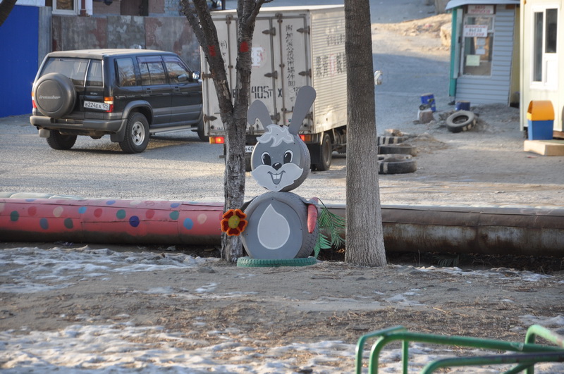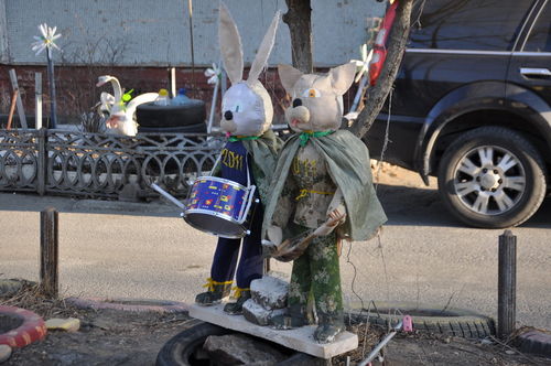 В итоге во дворе дома появились Дед Мороз, Снегурочка, заяц с волком, медвежонок с зайцом, лебеди, лошади. Все сделано из подручных материалов. Лебеди, лошади и медведь сооружены из автомобильных покрышек, частей деревьев и верёвок.