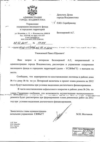 В адрес Павла Серебрякова в конце 2011 года, когда тот еще был депутатом Думы Владивостока, поступило несколько обращений от жителей улицы Печерской с просьбой помочь разобраться с сложившейся ситуации разрушенных лестниц, а также восстановления асфальтового покрытия в районе дома ул. Гамарника,24а.