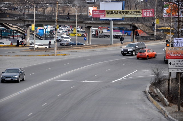 Разметка островков на повороте с улицы Русской в микрорайон Снеговая Падь