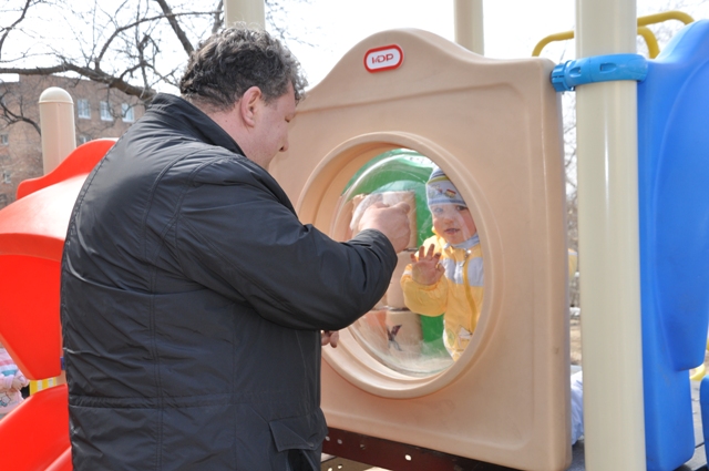 Взрослые также не прочь были поиграть на обновленной детской площадке и с удовольствием ловили своих детей на спуске горки.