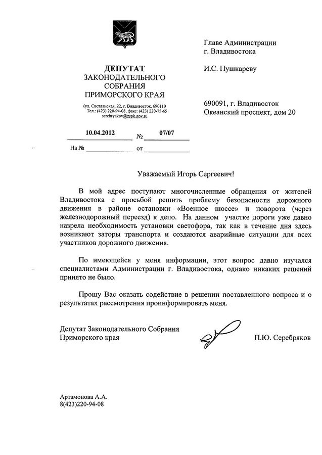 В адрес Павла Серебрякова неоднократно обращались автомобилисты с просьбой обратить внимание городских властей на ситуацию с дорожным движением в районе перекрестка улицы Военное шоссе и Народного проспекта. В настоящее время там наблюдаются частые заторы движения, которые создают аварийные ситуации.