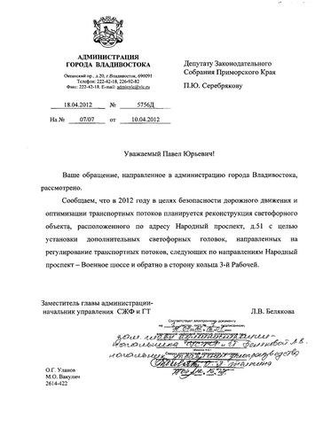 Администрация Владивостока прорабатывает схему движения на перекрестке Военного шоссе и Народного проспекта Администрация Владивостока прорабатывает схему движения на перекрестке Военного шоссе и Народного проспекта. Об этом говорится в ответе на обращение депутата Законодательного Собрания Павла Серебрякова.