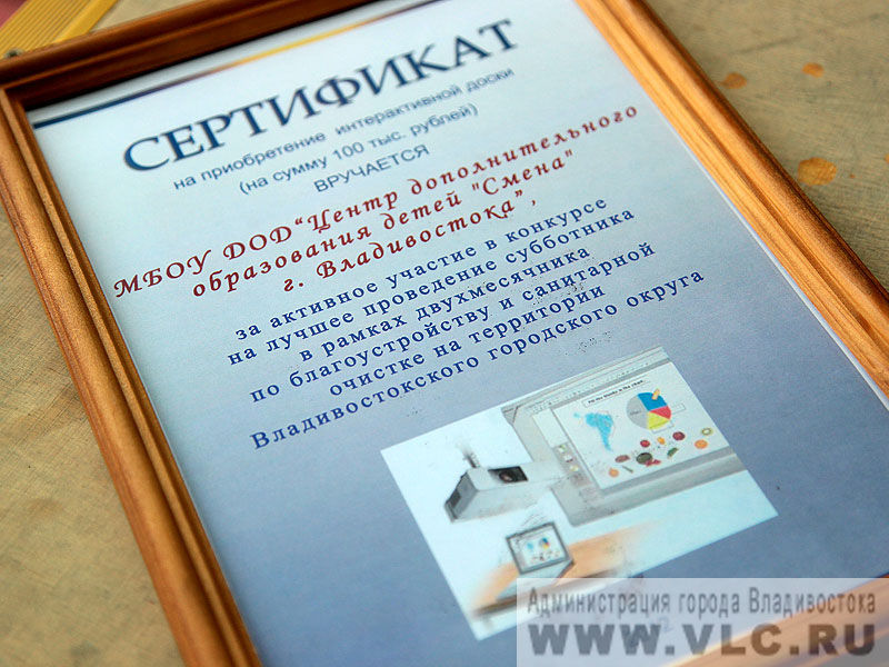 За участие в субботнике были награждены 3 детских сада Первореченского района: №№ 35, 182, 5, а также центр дополнительного образования детей «Смена». Заведующие детскими садами получили сертификаты на покупку детских площадок.