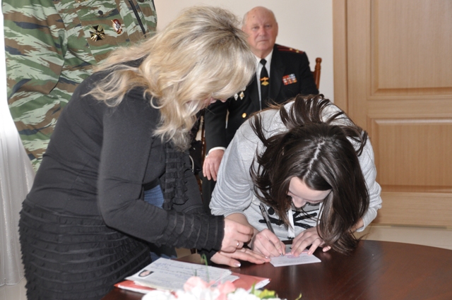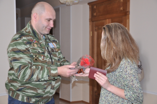 Это мероприятие проводится по инициативе УФМС Первореченского района и ЗАГСа каждый месяц уже несколько лет подряд. Сегодня для торжественного вручения паспортов пригласили полковника Геннадия Гальцева и участника боевых действий в Чечне Павла Гетмана.