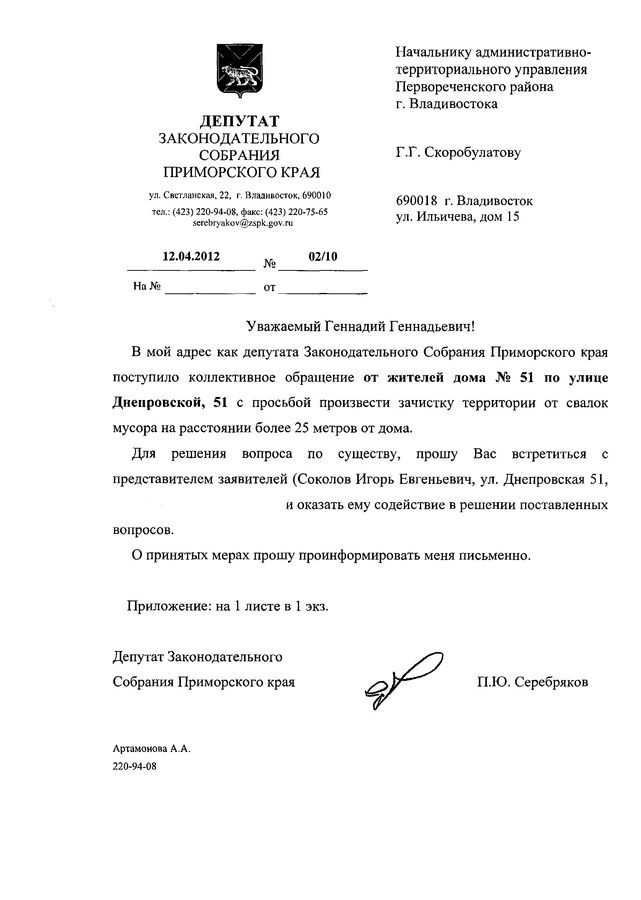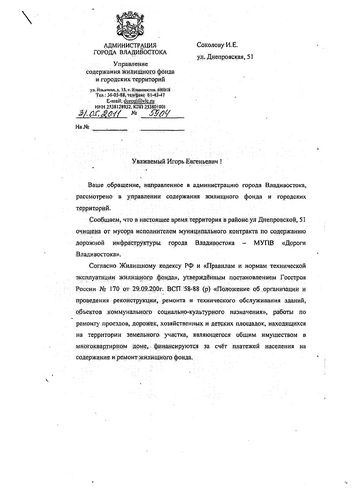 Администрация города в ответ на обращение депутата сообщила, что в настоящее время данная территория очищена от мусора исполнителем муниципального контракта по содержанию дорожной инфраструктуры города Владивостока – МУПВ «Дороги Владивостока».