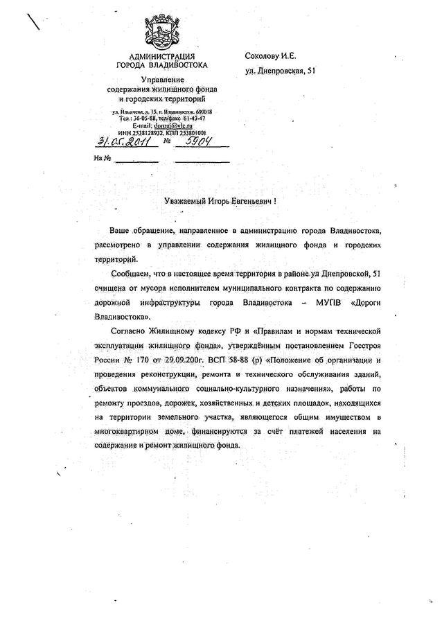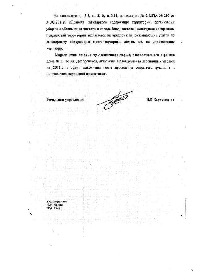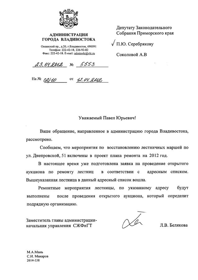 Согласно ответу администрации Владивостока, мероприятия по восстановлению лестничных маршей по ул. Днепровской,51 включены в проект плана ремонта на 2012 год. В настоящее время уже подготовлена заявка на проведение открытого аукциона по ремонту лестниц в соответствии с адресным списком. Ремонтные мероприятия лестницы по данному адресу будут выполнены поле определения подрядной организации.
