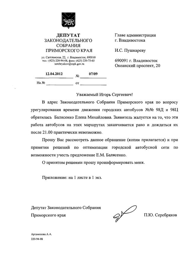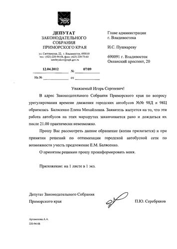 В адрес Павла Серебрякова поступило обращение от жительницы Первореченского района, проживающей недалеко от микрорайона "Снеговая падь", по вопросу движения автобусов маршрутов №№ 98ц и 98д в вечернее время суток. По словам обратившейся, данные вопросы заканчивают свою работу около 21.00, что сильно затрудняет передвижение по городу вечером.