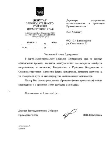 Также жительницей был задан вопрос по поводу движения междугородних автобусов сообщений «Владивосток – Славянка», «Владивосток – Краскино» и других направления в Хасанский район. По ее словам, с улучшением дорожной ситуации и ремонтом дороги Владивосток – Хасан, время дороги по этой трассе сократилось до 3-х часов, однако график движения автобусов не изменен. В этой связи водители вынуждены делать длительные остановки с целью своевременного прибытия в пункт назначения, что крайне не удобно для пассажиров.