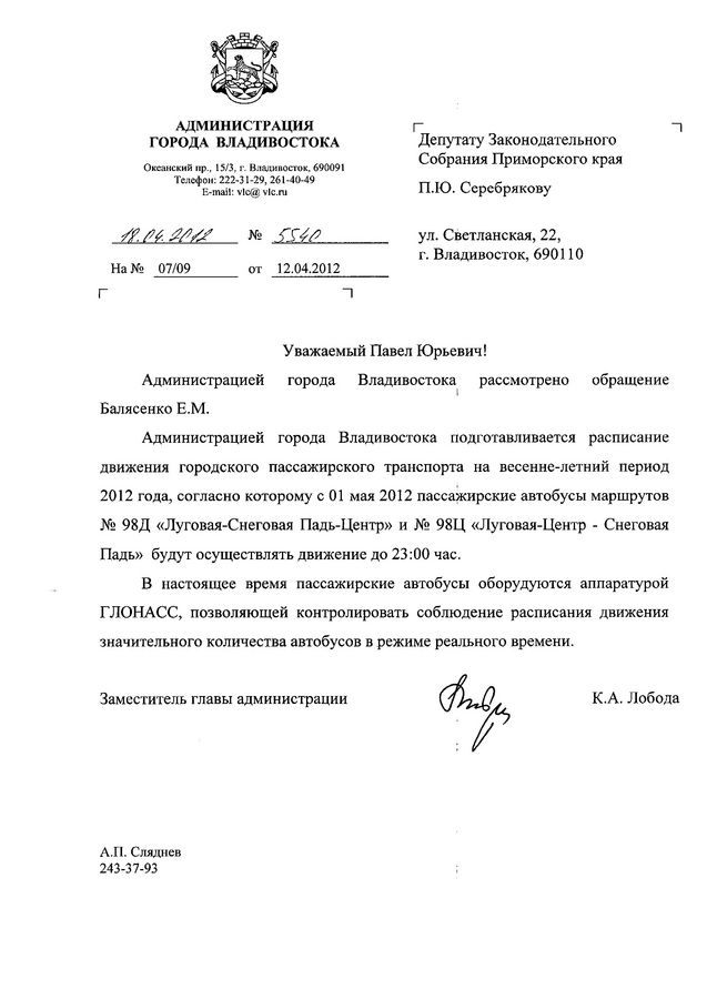 Как сообщили в администрации города Владивостока, в настоящее время, согласно расписанию дорожного транспорта на весенне-летний период 2012 года, с 1 мая пассажирские автобусы маршрутов №98д и 98д осуществляют движение до 23.00 часов. Также пассажирские автобусы оборудуются аппаратурой ГЛОНАСС, позволяющей контролировать соблюдение расписания движения значительного числа автобусов в режиме реального времени.