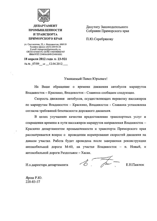 Согласно ответу департамента промышленности и транспорта Приморского края, скорость движения автобусов, осуществляющих перевозку пассажиров по маршрутов Владивосток- Славянка и Владивосток – Краскино, установлена согласно требований безопасности дорожного движения. В целях улучшения качества предоставления услуг и сокращения времени в пути пассажиров маршрутов данных направлений департаментом промышленности и транспорта Приморского края рассматривается вопрос о проведении нормирования скоростей движения на данном участке. Работа будет проведена после завершения реконструкции автомобильной дороги М-60, на участке Владивосток - поселок Новый и автомобильной дороги Раздольное – Хасан.