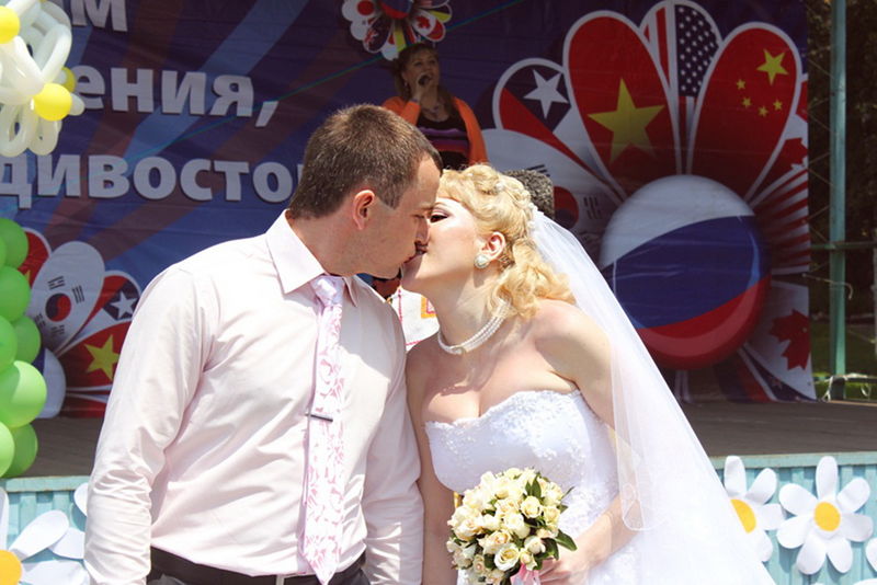 С поздравительным словом для молодых выступила Вера Селюк, начальник отдела ЗАГС Первореченского района: «Уважаемые супруги, впереди вас ждет много всего прекрасного и светлого. А так как ваш брак заключается накануне дня любви, семьи и верности, то я уверена, что он будет долгим и крепким».