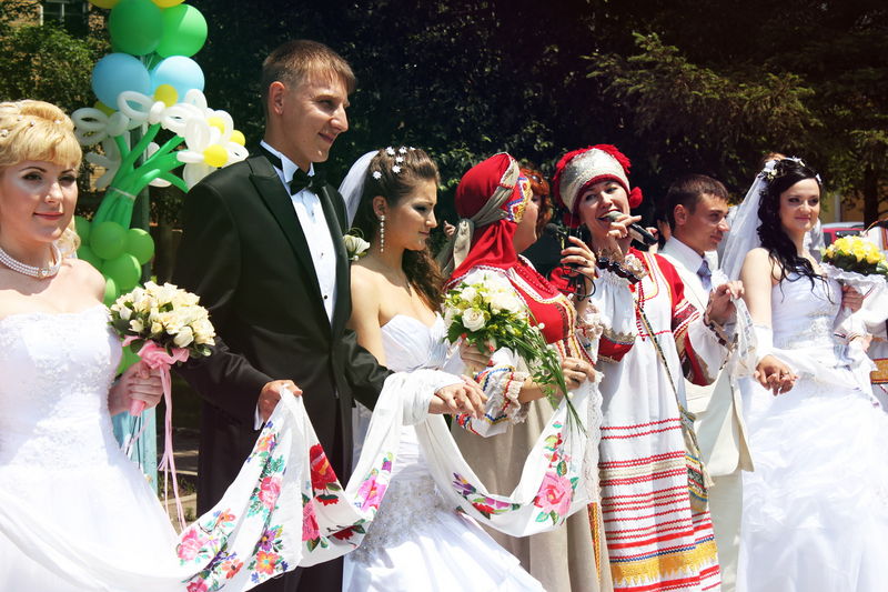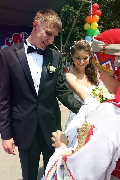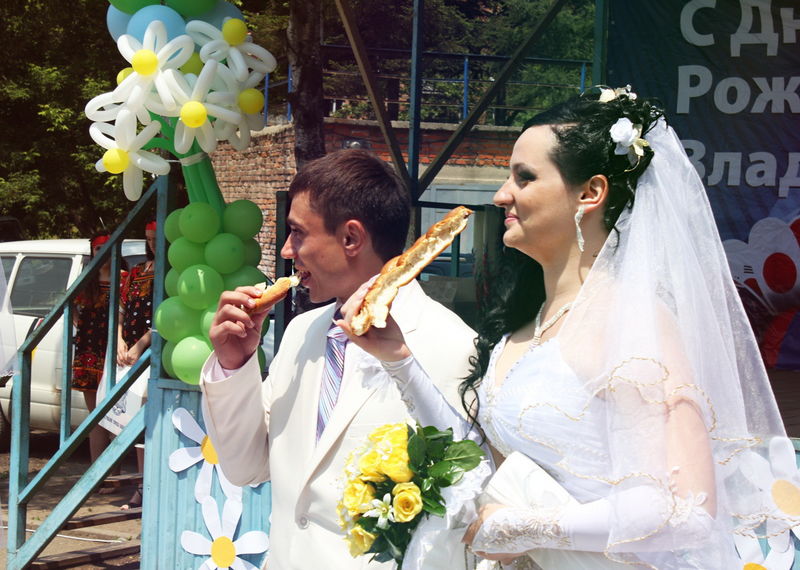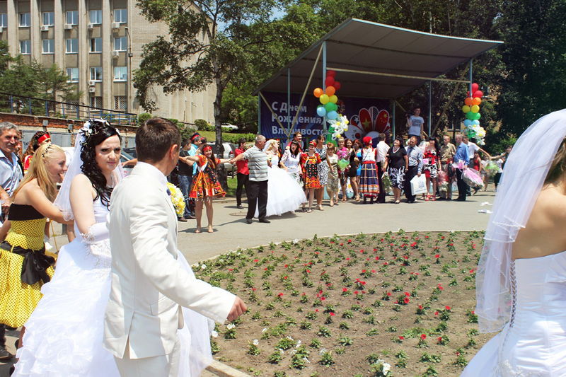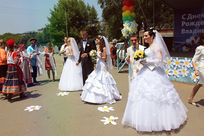 В канун дня Петра и Февронии многие пары решили связать свои отношения брачными узами. Для молодоженов в этот день возле Первореченского ЗАГСа состоялась праздничная программа. Три молодых пары успели и каравай попробовать, и хороводы поводить с гостями, и потанцевать.