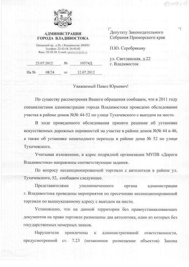 Пресечена стихийная торговля на улице Тухачевского Пресечена стихийная торговля на улице Тухачевского. Нарушители привлечены к административной ответственности. Об этом говорится в ответе администрации Владивостока на обращение депутата Законодательного Собрания Приморского края Павла Серебрякова.