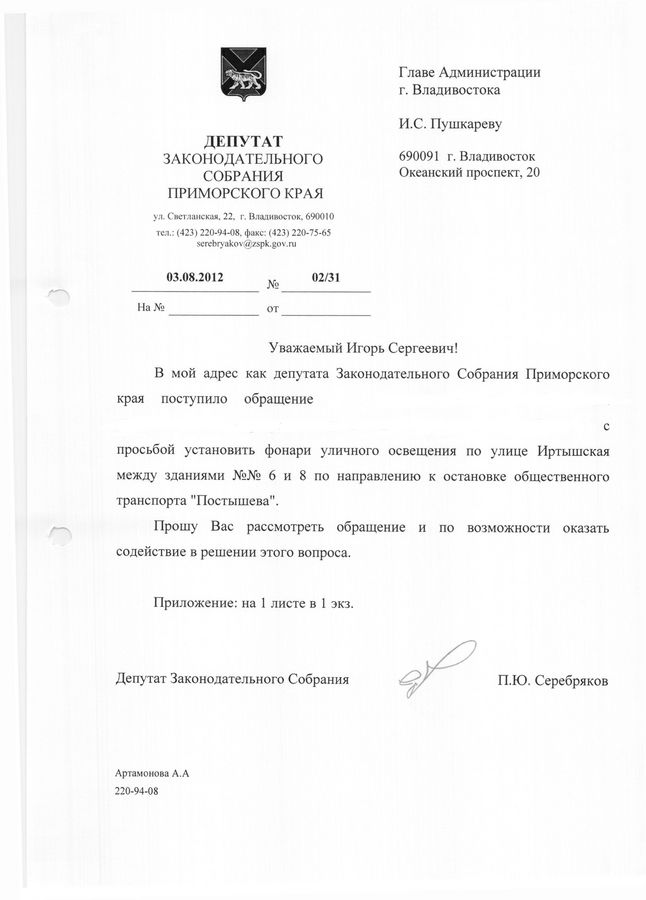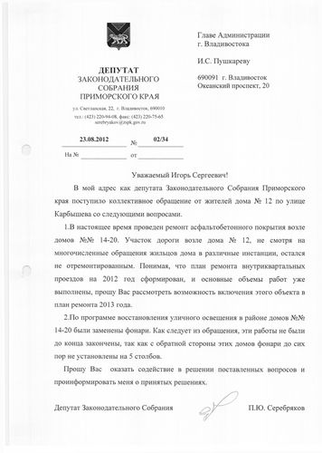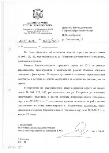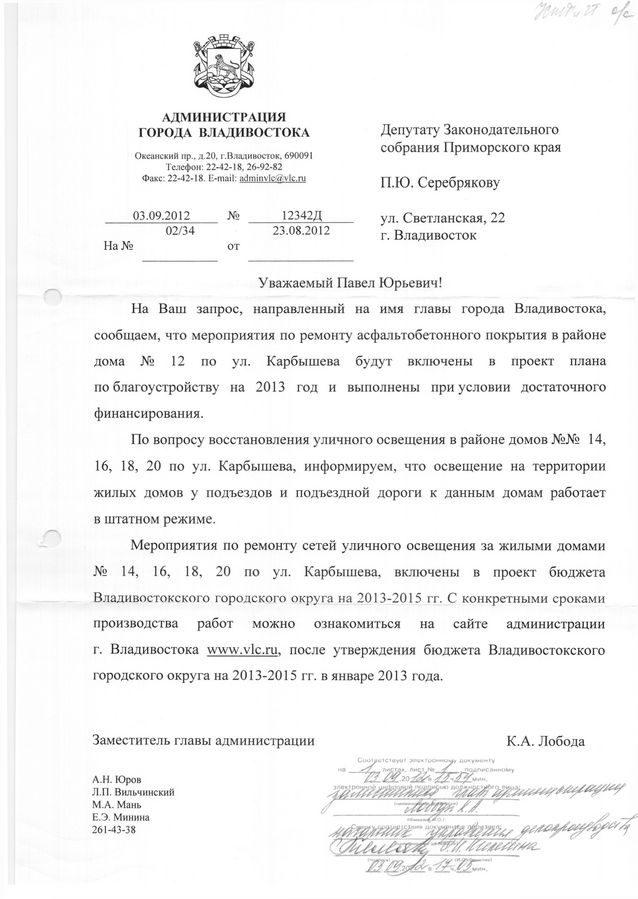 Улицы Гамарника и Карбышева осветят в 2013 году при условии достаточного финансирования![]() Улицы Гамарника и Карбышева осветят в 2013 году при условии достаточного финансирования. Об этом сообщили в администрации Владмвостока на запрос депутата Законодательного Собрания Приморского края Павла Серебрякова. В приемную депутата Законодательного Собрания Приморского края Павла Серебрякова обратились жители улиц Гамарника и Карбышева с просьбой установить фонари уличного освещения по улице Иртышской между домами №№6 и 8, также провести ремонтные работы по улице Карбышева между домами №№14-20. По словам жителей улицы Гамарника по участку между дома №№6 и 8 в вечернее время суток возвращаются домой дети со школы и с остановки «Постышева» в полной темноте, потому что он не освещается и угрожает жизни и здоровью не только взрослых, но и детей. Как ответила на обращение депутата администрация Владивостока, мероприятия по восстановлению сетей освещения дороги от жилых домов №10б, 12б, 14б расположенных по улице Гамарника до остановки «Постышева», включены в проект бюджета Владивостока на 2013-2015 год. С конкретными сроками производства работ можно ознакомиться на сайте администрации города www.vlc.ru после утверждения бюджета Владивостокского городского округа на 2013-2015 год в январе 2013 года. С проблемой неосвещенности дороги столкнулись и жители БАМа. По их словам по программе восстановления освещения часть фонарей на улице Карбышева была заменена, но до конца работы не были закончены. Со стороны домов №14-20 старые фонари сняли два года назад, а новые так и не поставили, однако эта дорога для многих жителей является единственным путем до дома. Ситуацию усугубляет еще и то, что дорога разбита, а рядом производится стройка, поэтому хождение по ней в темноте стало небезопасно. В ответе администрации Владивостока по этой проблеме говорится, что мероприятия по ремонту асфальтобетонного покрытия в районе дома №12 по ул. Карышева будут включены в проект плана по благоустройству на 2013 год и выполнены при условии достаточного финансирования. По вопросу восстановления уличного освещения в районе домов №№14, 16, 18, 20 по ул. Карбышева ответили, что освещение на территории жилых домов у подъездов и подъездной дороги работает в штатном режиме. Мероприятия по ремонту сетей уличного освещения за жилыми домами №№ 14, 16, 18, 20 по ул. Карбышева включены в проект бюджета Владивостока на 2013-2015 год. С конкретными сроками производства работ можно ознакомиться на сайте администрации Владивостока www.vlc.ru, после утверждения бюджета Владивостокского городского округа на 2013-2015 год в январе 2013 года.