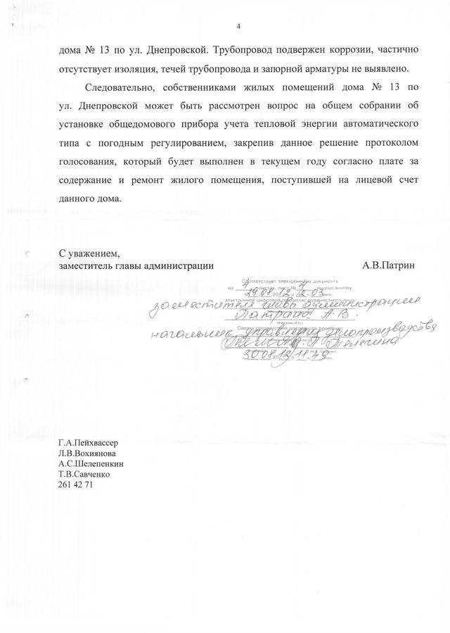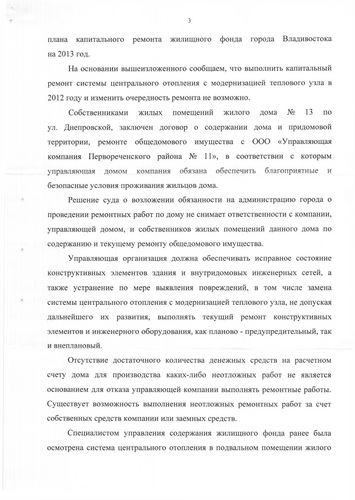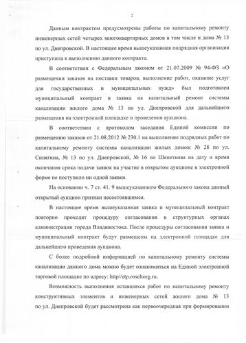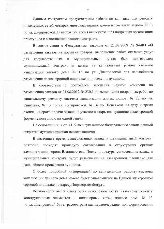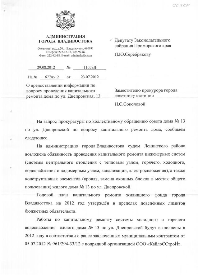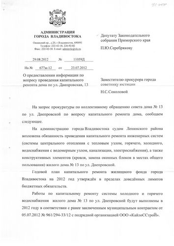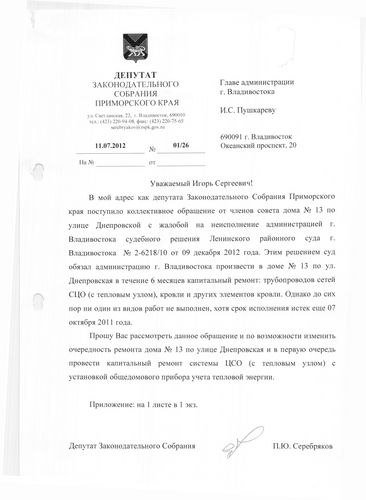 В приемную депутата Павла Серебрякова поступило коллективное обращение от членов совета дома №13 по улице Днепровской с жалобой на неисполнение администрацией Владивостока судебного решения Ленинского суда от 9 декабря 2012 года. Этим решением суд обязал администрацию города произвести в доме №13 по улице Днепровской в течение 6 месяцев капитальный ремонт: трубопроводов сетей СЦО (с тепловым узлом), кровли и других элементов. Однако ни один из видов ремонтных работ не выполнен, хотя срок исполнения истек еще 7 декабря 2011 года.
