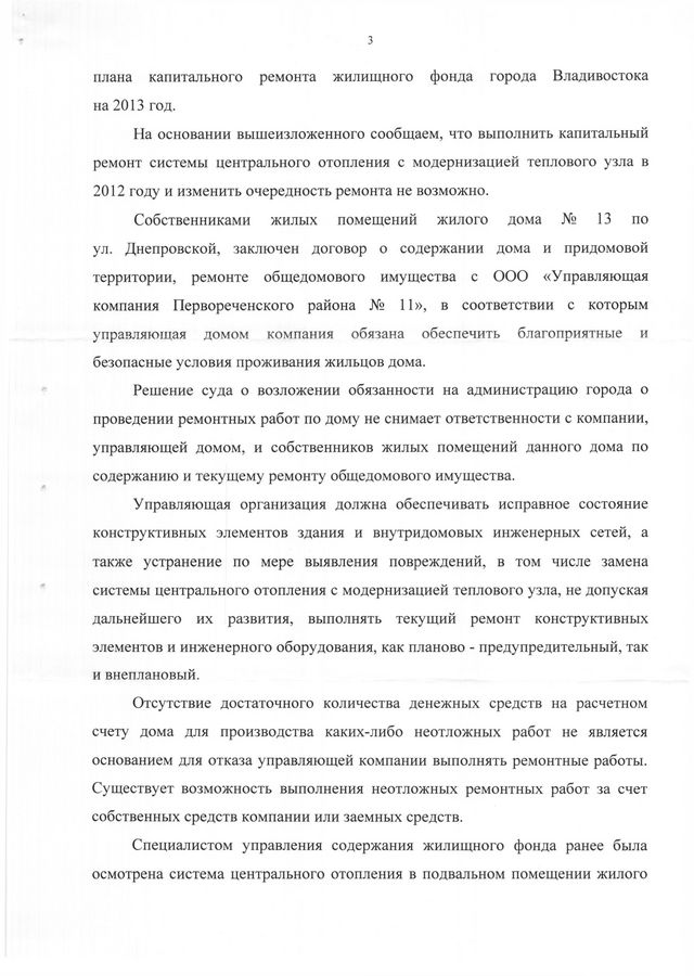 Возможность выполнения оставшихся работ по капитальному ремонту конструктивных элементов и инженерных сетей жилого дома №13 по ул. Днепровской будет рассмотрена как первоочередная при формировании плана капитального ремонта жилищного фонда г. Владивостока на 2013 год.