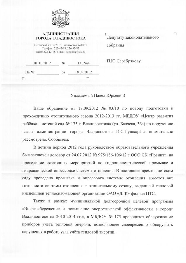 По этому поводу депутатом было сделано обращение в администрации Владивостока. Как ответили Павлу Серебрякову в администрации города, в 2013 году планируется выполнить работы по замене деревянных оконных блоков на окна из ПВХ в детском саду №175.