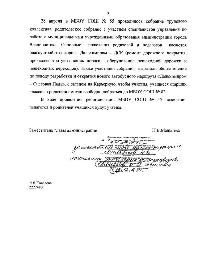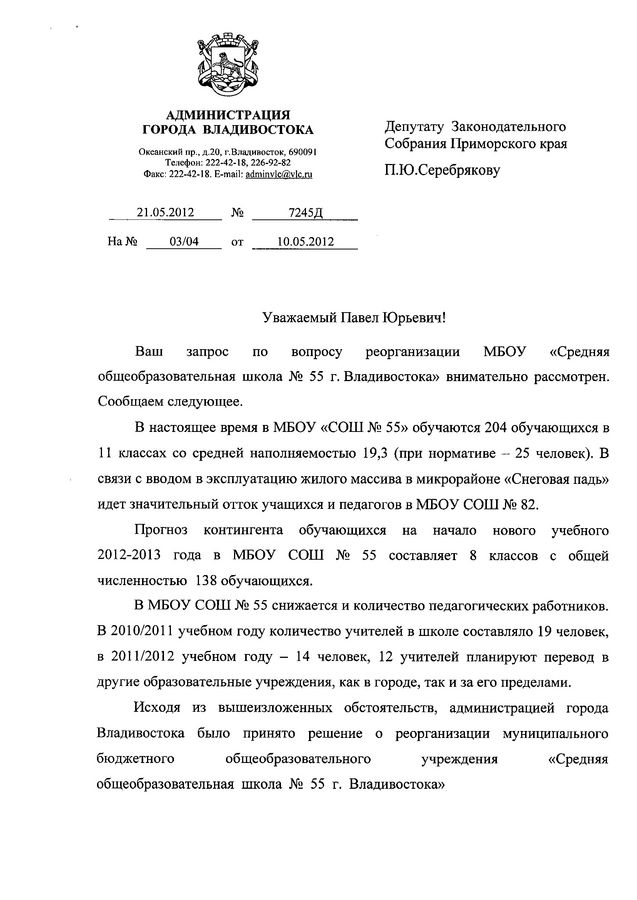 Напомним, что в мае текущего года при закрытии школы №55 и переводе детей в школу №82, депутат Павел Серебряков делал запрос в администрацию Владивостока с учетом пожелания родителей учеников закрывающейся школы.
