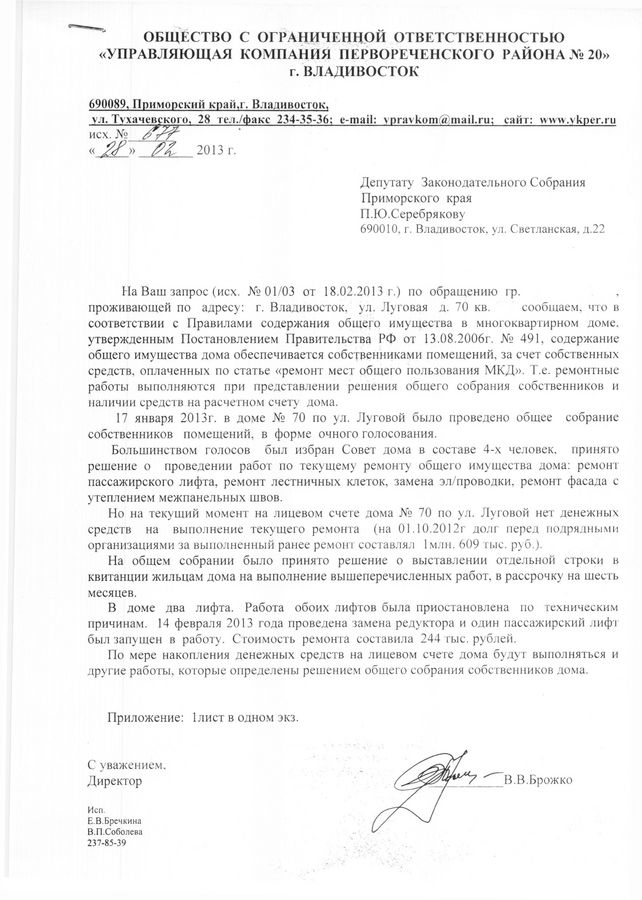 Согласно ответу генерального директора управляющей компании Виктора Брожко, на текущий момент на лицевом счете дома нет денежных средств на выполнение ремонта. Долг перед подрядными организациями за выполненный ранее ремонт составлял 1 млн 609 тысяч рублей.