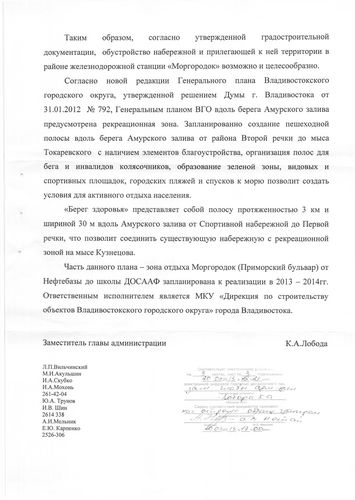 Парковая зона в районе станции «Моргородок» появится в Первореченском районе Обустройство набережной и прилегающей к ней территории в районе железнодорожной станции «Моргородок» возможно и целесообразно, согласно утвержденной градостроительной документации. А зона отдыха «Моргородок» от Нефтебазы до школы ДОСААФ запланирована к реализации уже в 2013-2014 годах. Об этом говорится в ответе администрации Владивостока на запрос депутата Законодательного Собрания Приморского края Павла Серебрякова.
