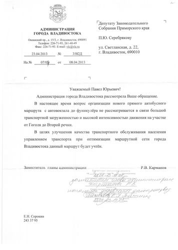 В общественную приемную депутата Павла Серебрякова обратился студент ДВФУ с вопросом о введении прямого автобусного маршрута от остановки «Автовокзал» до остановки «Фуникулер».