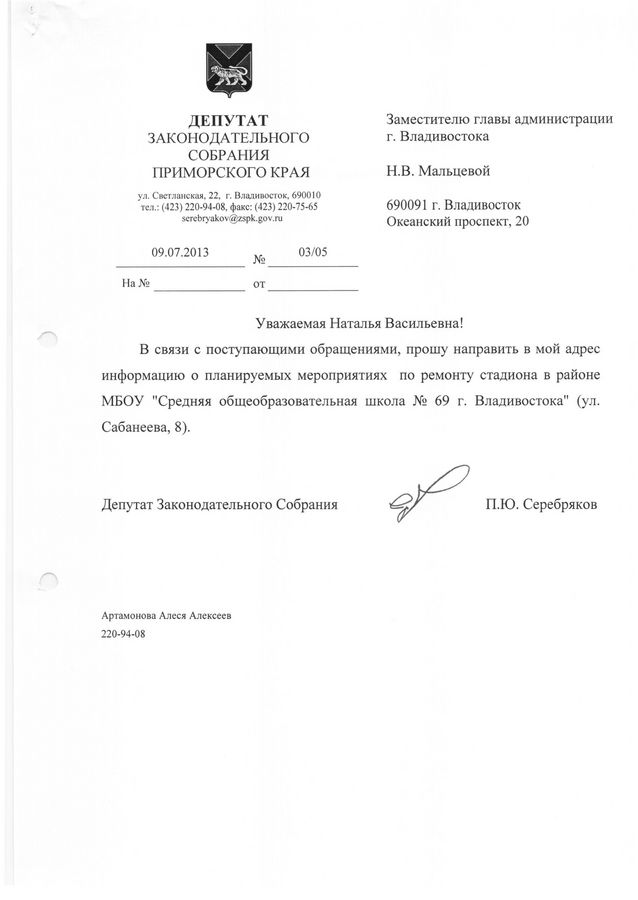 В общественную приемную депутата Законодательного Собрания Павла Серебрякова обратились жители Первореченского района с просьбой выяснить, запланирован ли ремонт стадиона возле школы №69.