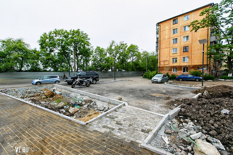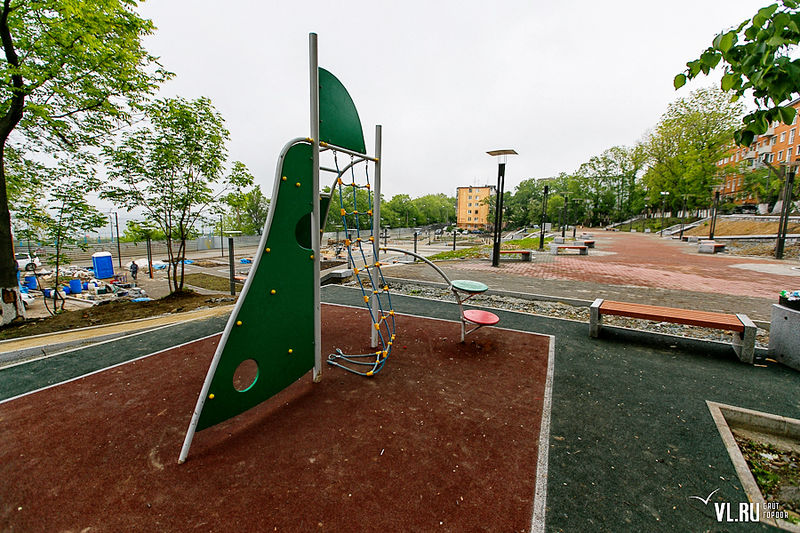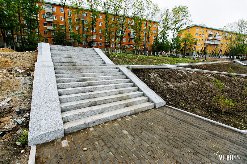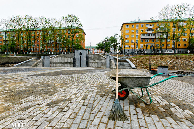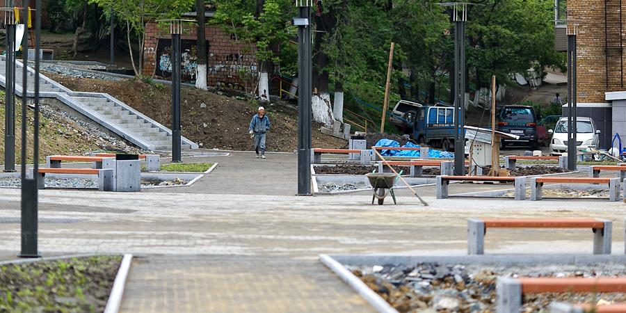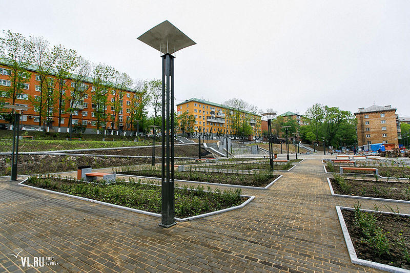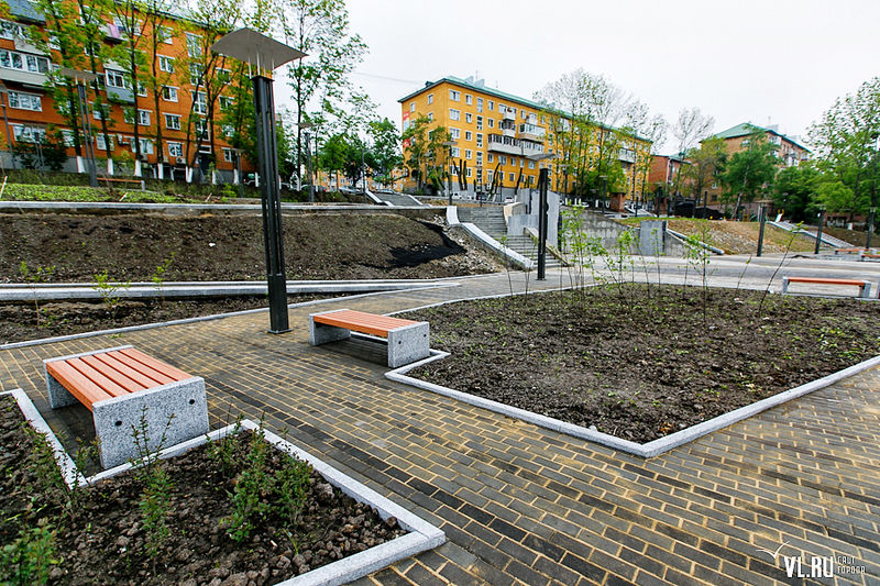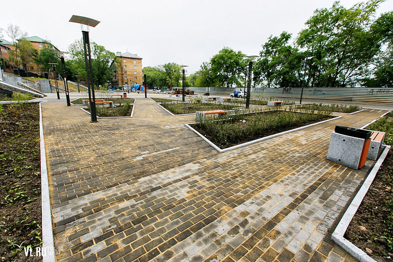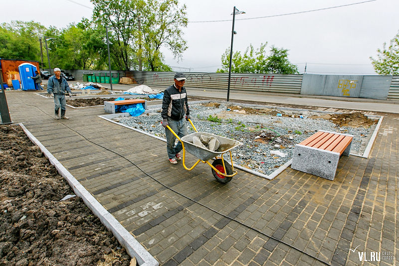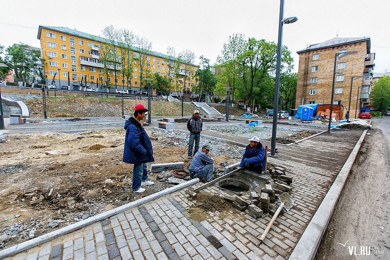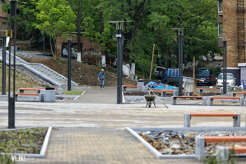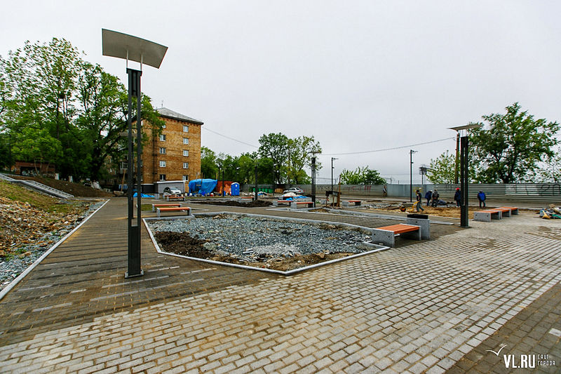 Работы на объекте стартовали в конце прошлого года. Раньше здесь находилось захоронение, о котором узнали тогда, когда на этом месте началось строительство дома. Все останки перезахоронили, а вместо дома было решено разбить сквер в память о людях, похороненных здесь. Многие из них строили Владивосток.