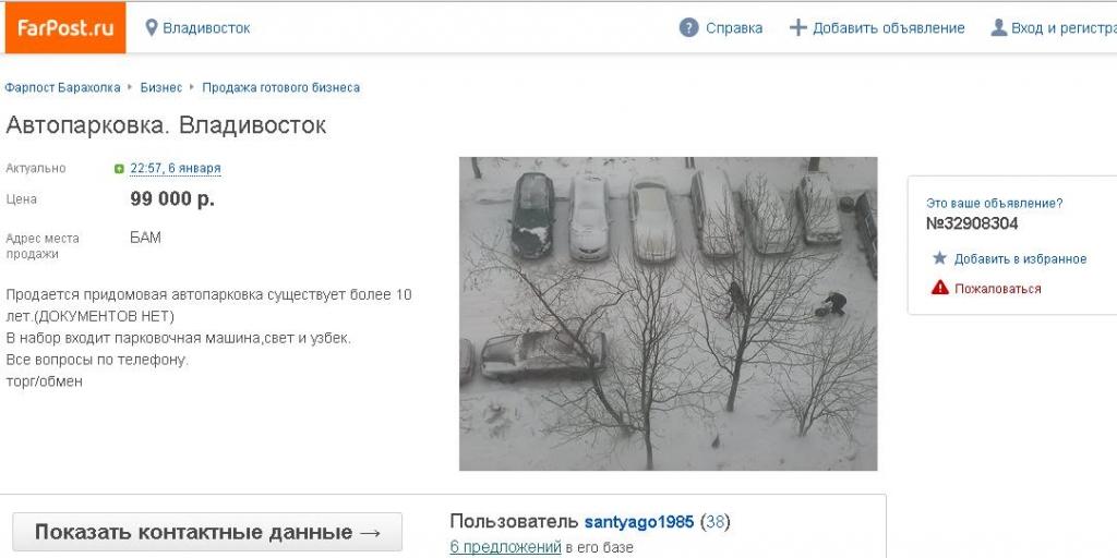 "Раньше платили все, просто нормальный сторож уехал на родину и оставил вместо себя некомпетентного парня. Если поставить нормального, то за пару месяцев можно навести порядок", - пишет автор объявления, отвечая на вопрос потенциального покупателя. Напомним, нелегальные придомовые парковки во Владивостоке существуют во многих дворах. Полиция регулярно проводит рейды по их проверке. Количество выявленных нелегальных предприятий по "ночной охране машин" ежегодно исчисляется сотнями. Полицейские отмечают, основная сложность в ликвидации незаконных автопарковок заключается в том, что жители домов в большинстве случаев добровольно оплачивают услуги сторожей-самозванцев, мотивируя свои поступки недостаточным количеством официальных автостоянок в микрорайонах и желанием оставлять машины во дворе, под окнами своих квартир.